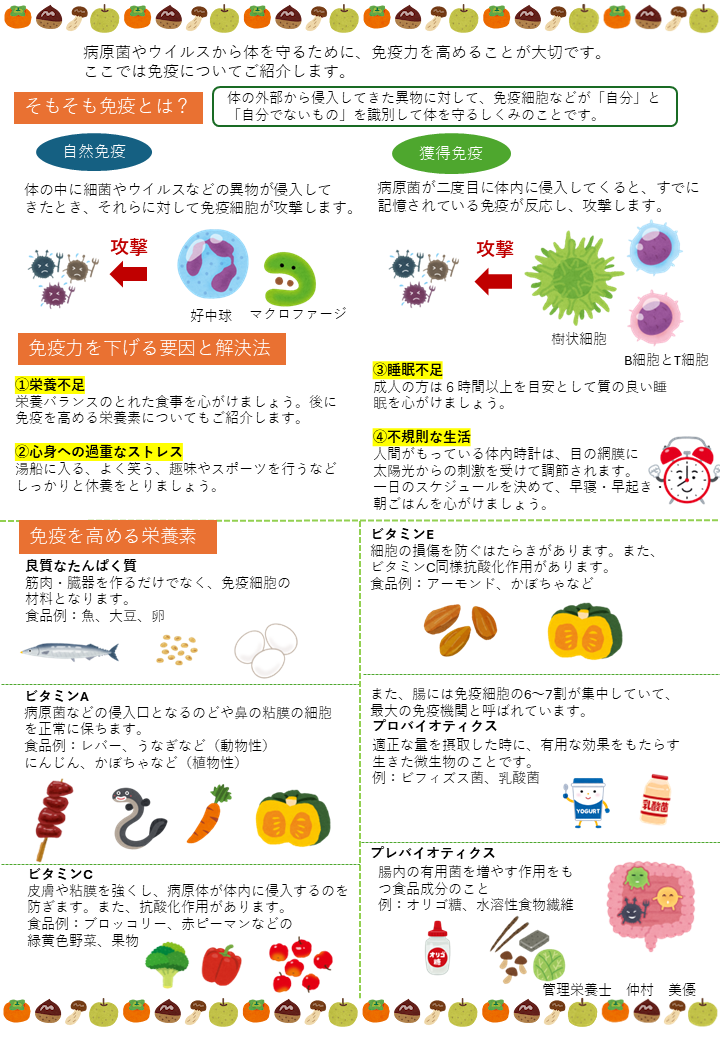 また、病原菌ウイルスを体から守るために大切な、「免疫」について、