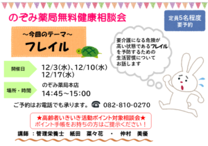 2025年11月17日 / 最終更新日時 : 2025年11月17日 fourleaf 健康勉強会 本店健康相談会 2025.12月 本店の12月の健康相談会は「フレイル」についてのお話です。 店頭またはお電話でご予約を承っておりますのでお気軽にお申し付けください。