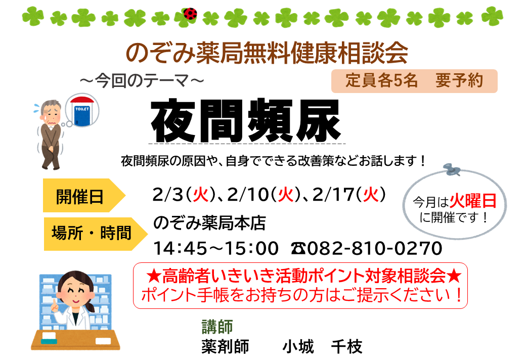 2026年1月22日 / 最終更新日時 : 2026年1月22日 fourleaf 健康勉強会 本店健康相談会 2026.2月 本店の2月の健康相談会は「夜間頻尿」です。 店頭またはお電話でご予約を承っておりますのでお気軽にお申し付けください。