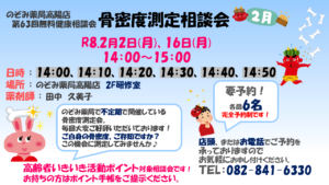2026年1月22日 / 最終更新日時 : 2026年1月22日 fourleaf 健康勉強会 高陽店健康相談会 2026.2月 高陽店の2月の健康相談会は「骨密度測定相談会」です。 店頭またはお電話でご予約を承っておりますのでお気軽にお申し付けください。